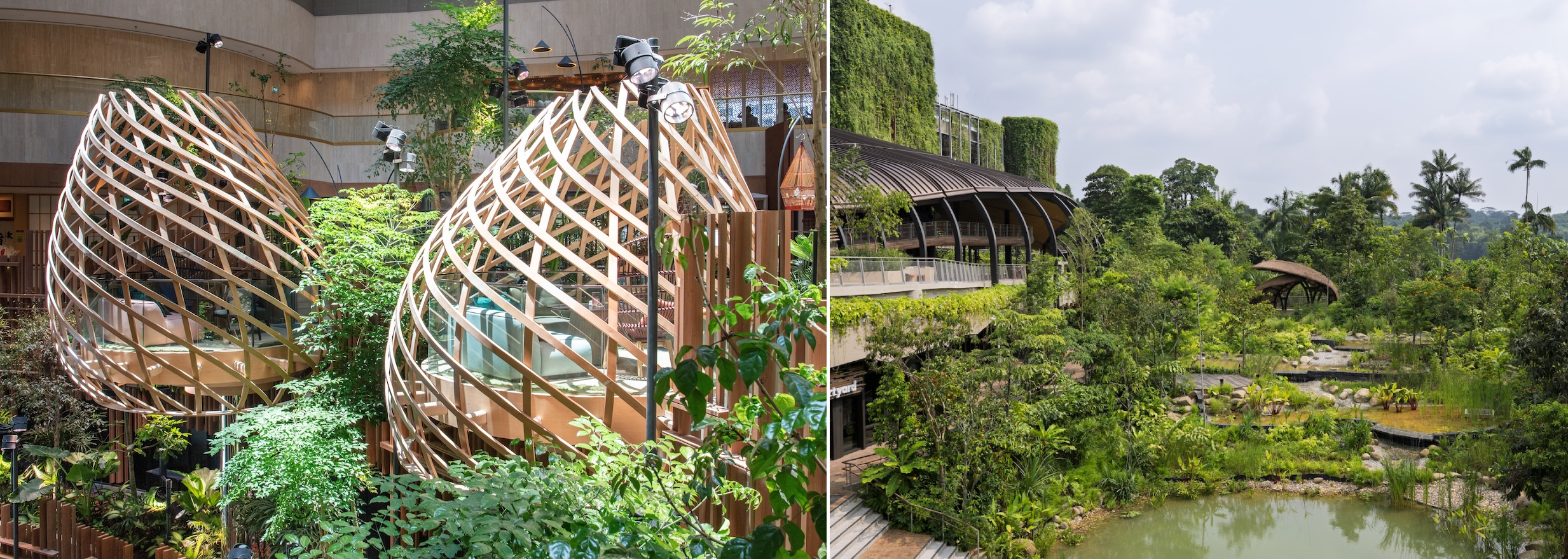 Tropical urban oases created by Henning Larsen. Left: Interior gardens at Parkroyal Marina Bay; Right: Cleansing biotopes at Mandai East.